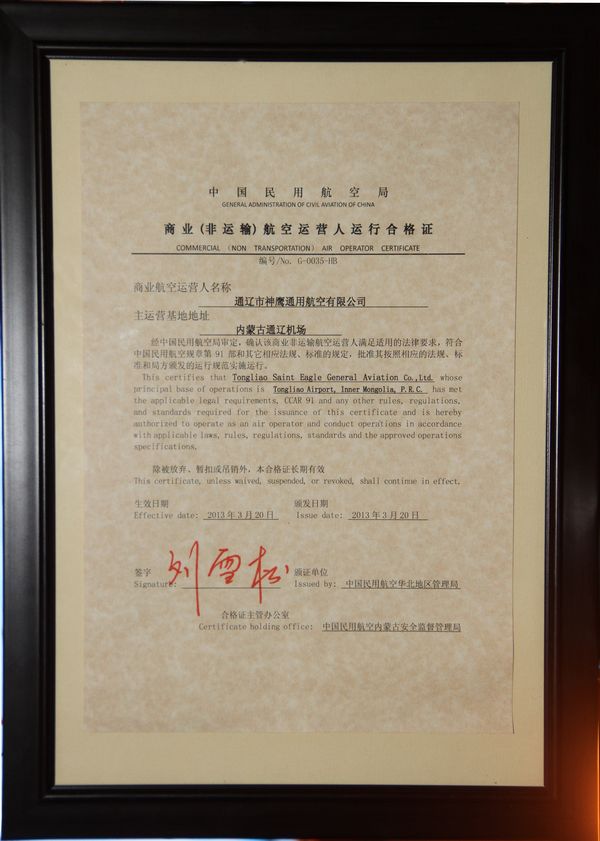 2013年3月28日,通遼神鷹通用航空有限公司CCAR-91部運行合格審定頒證儀式在神鷹通航召開。神鷹通航孫學(xué)慧副總經(jīng)理主持了本次會議,內(nèi)蒙古監(jiān)管局副局長李陸康向通遼神鷹通用航空公司頒發(fā)了《商業(yè)非運輸航空運營人運行合格證》, 內(nèi)蒙古機場集團公司通遼分公司領(lǐng)導(dǎo)參加了頒獎儀式。這是內(nèi)蒙古地區(qū)第三家獲得CCAR-91部運行許可的通用航空公司,也彌補了內(nèi)蒙古中東部地區(qū)通航事業(yè)的空白。